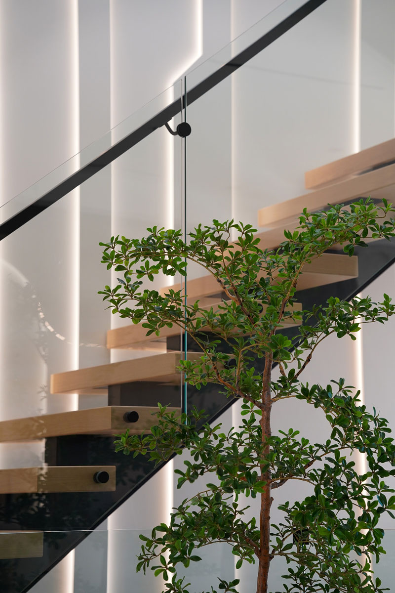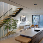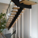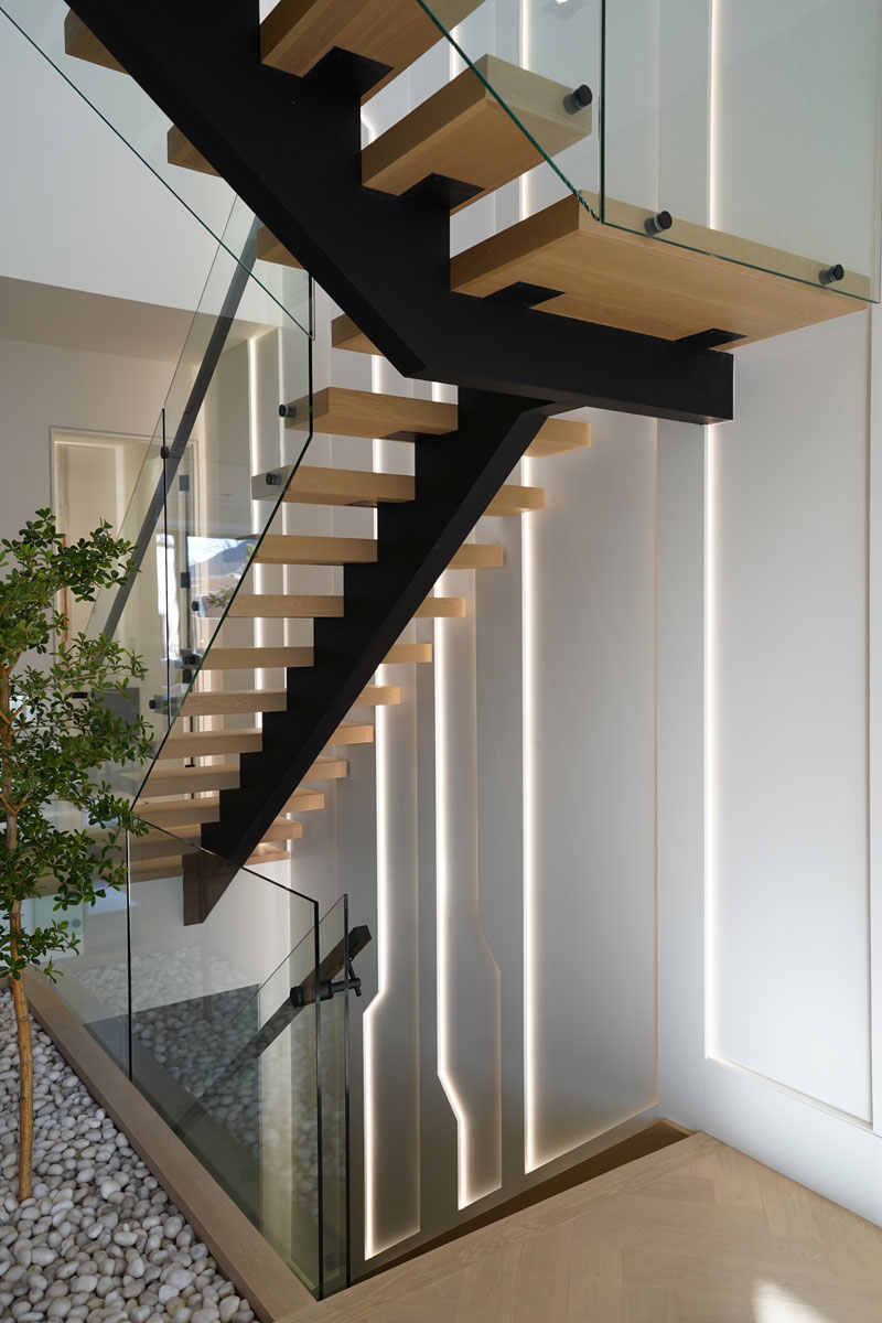 The staircase serves as a sculptural element within the home. Floating treads, glass guards, and integrated lighting demanded advanced coordination between structural steel, finish carpentry, and glazing systems. From a construction standpoint, achieving this visual lightness required hidden connections and meticulous sequencing to preserve clean sightlines.