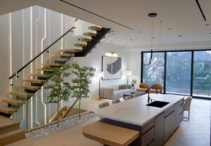 The project demanded a high level of precision across framing, concrete work, and envelope construction. Floor-to-ceiling windows, flush detailing, and integrated lighting systems required tight tolerances and close sequencing between trades. Structural elements were coordinated early to allow for floating stair assemblies, concealed connections, and uninterrupted ceiling planes.
