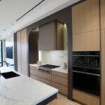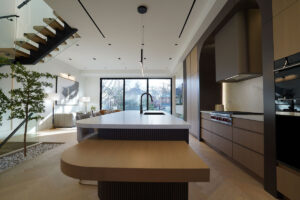Interior spaces are defined by custom-built elements rather than applied decoration. The kitchen and dining areas feature bespoke millwork with integrated appliances, concealed storage, and refined edge details. From a builder’s perspective, this required millimeter-level accuracy in substrate preparation, cabinet installation, and coordination with mechanical and electrical systems.