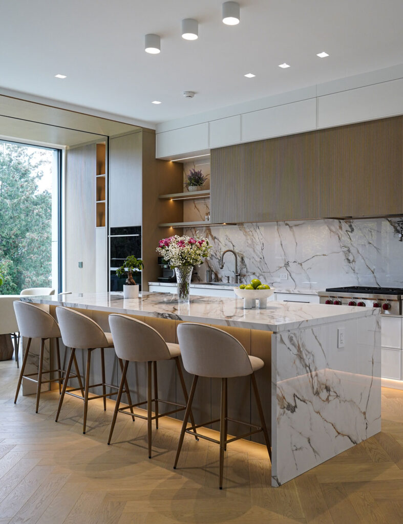This interior detail highlights the careful coordination between natural stone surfaces and custom wood millwork within a contemporary Toronto residence. The composition emphasizes clean junctions, refined proportions, and a restrained material palette, allowing texture and craftsmanship to define the space rather than ornamentation.